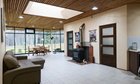 Дом максимально интегрирован в окружающую среду, визуально спрятан в глубине холма. Большая часть стены по периметру – панорамное окно со стеклами, удерживающими тепло. Смотровое окно есть и в потолке, таким образом, сидя у камина, можно любоваться и пробегающими облаками, и вековым лесом.